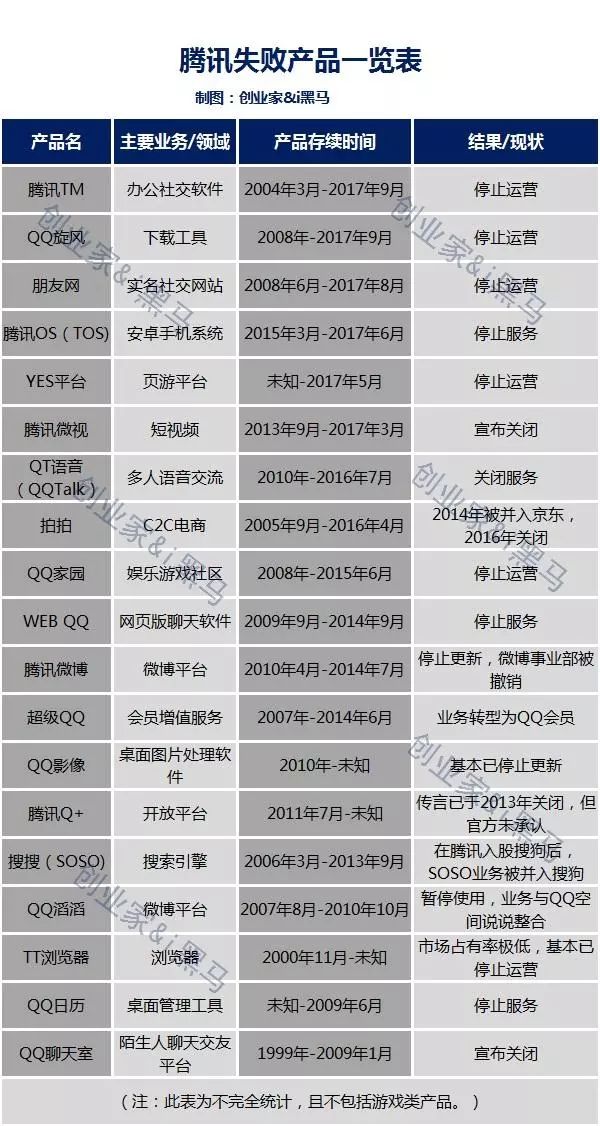 创业家&i黑马梳理了腾讯曾经的产品“阵亡”榜。昔日腾讯“失败”产品的列表中,包括了腾讯拍拍、搜搜、朋友网、微博、微视等产品,涉及了电商、搜索乃至社交等领域。创业家&i黑马在腾讯“做死”的产品里,也挑选了一些有代表性的案例,通过梳理分析,尝试一窥腾讯产品路线的发展轨迹。