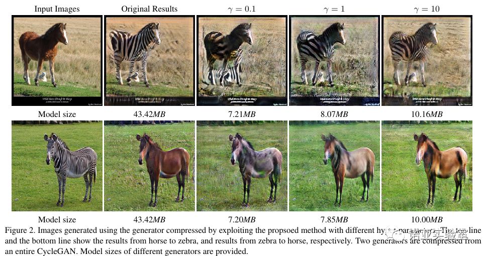 是原始网络中的判别器。与公式1相比,公式2并不直接关注压缩前后的生成器模型在像素级别的相似性,而是通过判别器,更加关注压缩前后风格的一致性,这对压缩生成器是一个更好的优化方向。