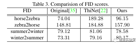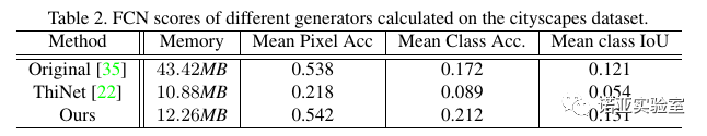 与传统剪枝方法比较:表2和表3分别列出了压缩前后,传统的剪枝方法和论文提出的剪枝方法在三个数据集上的量化结果。在cityscapes数据集采用FCN分数,horse2zebra和summer2winter数据集采用FID分数,论文提出方法结果与压缩之前的模型接近,远远好于传统的剪枝方法。