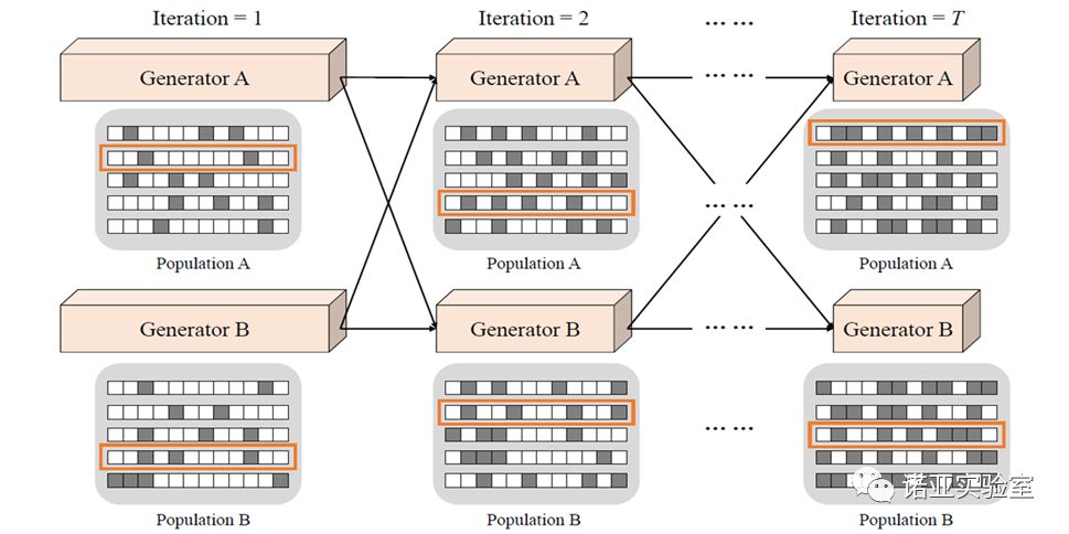 维持一个种群,也可以通过进化算法选出适应值最优的个体。但是,通过公式8可以看出,循环一致性误差计算同时涉及两个生成器,所以同时对