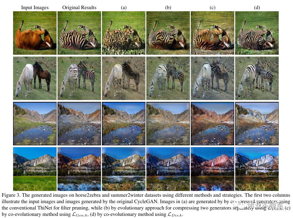 消融实验:在实验数据和超参数相同的情况下,我们比较了不用的进化策略和优化目标的影响,如下图3所示。(a)是采用传统的剪枝方法的结果,(c)采用了类似于传统剪枝最小重构误差的生成器感知误差,(b)和(d)则采用了本文提出的判别器感知误差,其中(b)是单独优化一个生成器的结果,而(d)是采用协同的策略同时优化两个生成器的结果。