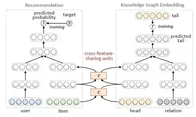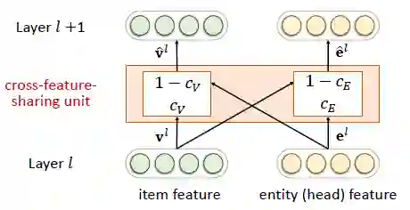 由于推荐系统中的物品和知识图谱中的实体存在重合,所以两个任务并非相互独立。我们在两个任务中设计了交叉特征共享单元(cross-feature-sharing units)作为两者的连接纽带。