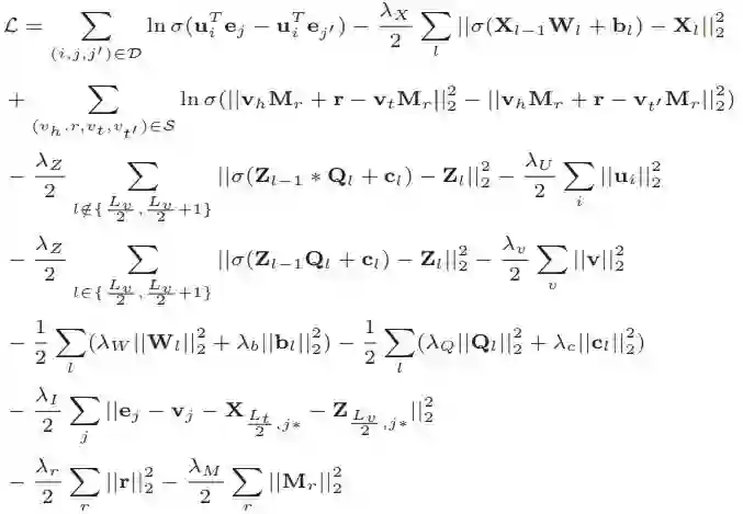 我们将三种知识学习的目标函数与推荐系统中的协同过滤结合,得到如下的联合损失函数: