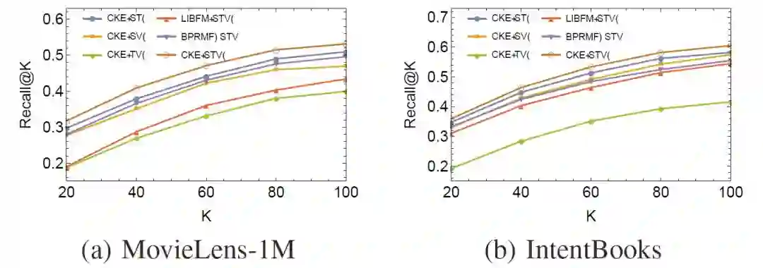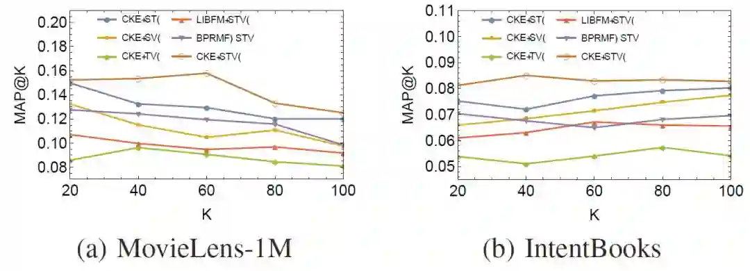 使用诸如随机梯度下降(SGD)的方法对上述损失函数进行训练,我们最终可以得到用户/物品向量,以及实体/关系向量。CKE在电影推荐和图书推荐上取得了很高的Recall值和MAP值: