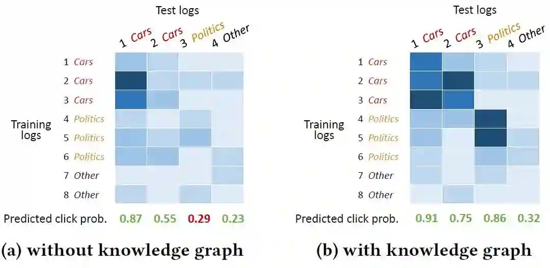 我们也可以通过注意力权重的可视化结果看出,注意力机制的引入对模型的最后输出产生了积极的影响。由于注意力机制的引入,DKN可以更好地将同类别的新闻联系起来,从而提高了最终的正确预测的数量: