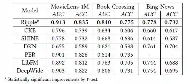 类似于CKE,我们在该损失函数上训练即可得到物品向量和实体向量。需要注意的是,Ripple Network中没有对用户直接使用向量进行刻画,而是用用户点击过的物品的向量集合作为其特征。Ripple Network在电影、图书和新闻的点击率预测上取得了非常好的效果: