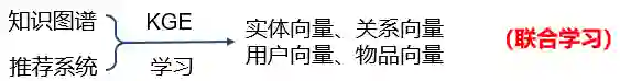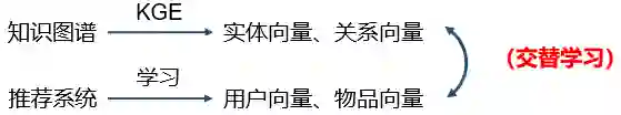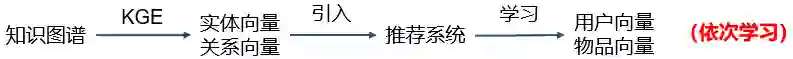 依次学习(one-by-one learning)。首先使用知识图谱特征学习得到实体向量和关系向量,然后将这些低维向量引入推荐系统,学习得到用户向量和物品向量;