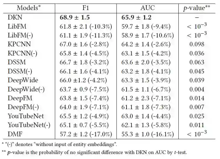 该模型在新闻推荐上取得了很好的效果:DKN取得了0.689的F1值和0.659的AUC值,并在p=0.1水平上比其它方法取得了显著的提升。