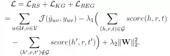 最终得到的推荐算法和知识图谱特征学习的联合损失函数如下: