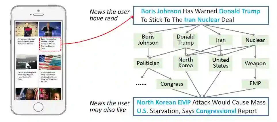 我们以新闻推荐[1]为例来介绍依次学习。如下图所示,新闻标题和正文中通常存在大量的实体,实体间的语义关系可以有效地扩展用户兴趣。然而这种语义关系难以被传统方法(话题模型、词向量)发掘。