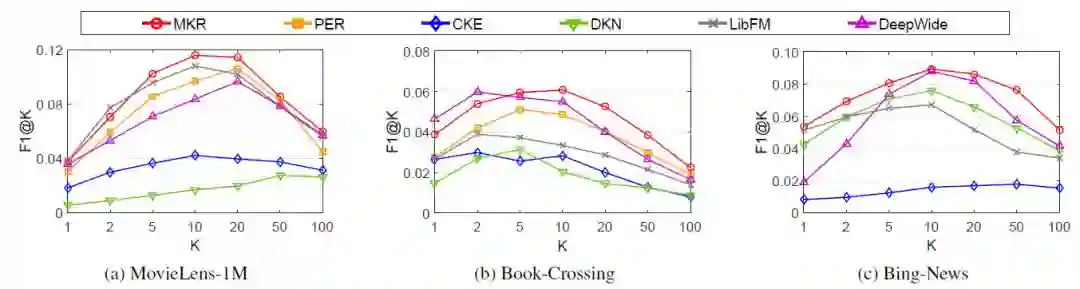 MKR在电影、图书和新闻推荐上也取得了不错的效果,其F1@K指标在绝大多数情况下都超过了baseline方法: