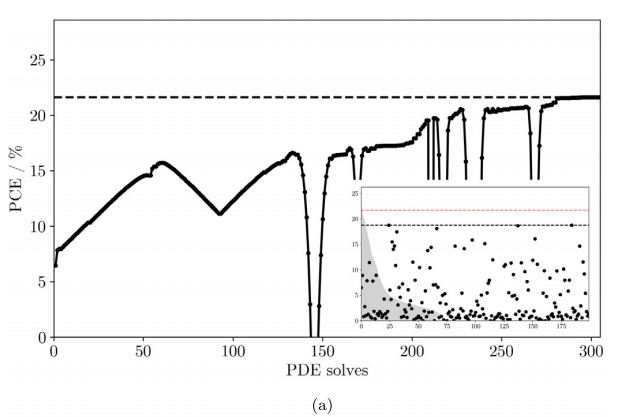 从 PCE 为 6.49% 的随机抽样初始设计开始,该算法仅在 306 次 PDE 求解后终止,达到 PCE 为 21.62% 的最佳点。这高于所有 200 个随机抽样设计的结果,后者相当于大约 4000 个 PDE 求解。