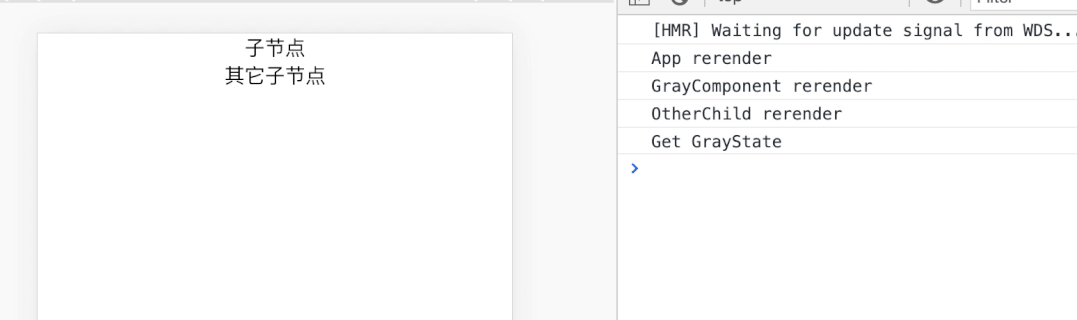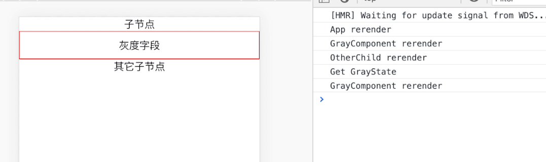 // GrayState.jsclass GrayState {constructor() {this.observers = [];this.status = {};}attach(func) {if (!this.observers.includes(func)) {this.observers.push(func);}}detach(func) {this.observers = this.observers.filter(observer => observer !== func);}updateStatus(val) {this.status = val;this.trigger();}trigger() {for (let i = 0; i < this.observers.length; i++) {this.observers[i](this.status);}}}export default new GrayState();// App.jsimport GrayState from './GrayState.js';function App() {console.log('App rerender');useEffect(() => {console.log('Get GrayState');setTimeout(() => {const nextStatus = {gray: true,};GrayState.updateStatus(nextStatus);}, 200);}, []);return (<div><GrayComponent /><OtherChild /></div>);}// GrayComponent/index.jsimport GrayState from './GrayState.js'function GrayComponent() {console.log('GrayComponent rerender');const [visible, setVisible] = useState(false);useEffect(() => {const changeVisible = (status) => {setVisible(status.gray);};GrayState.attach(changeVisible);return () => {GrayState.detach(changeVisible);};}, []);return (<div>子节点{visible && <div>灰度字段</div>}</div>);}