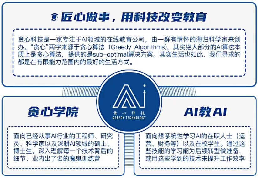 北京贪心科技有限公司是一家追求极致、有情怀的教育科技公司,目前专注在泛AI领域的在线教育,从产品的角度我们提供非常体系化的AI内容,满足不同用户对技能提升的需求。
