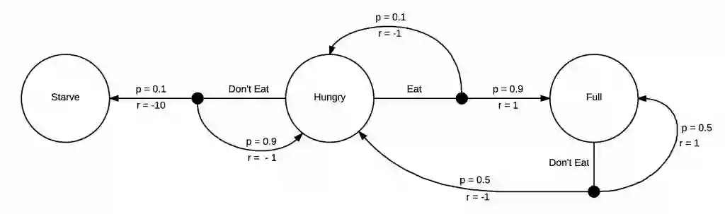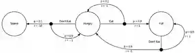 由于这个MDP是十分简单的,我们很容易发现待在一个更高奖励的区域的方式,即当我们饥饿的时候就吃。在这个模型中,当我们处于吃饱状态的时候没有太多其它的选择,但是我们将会不可避免的再次饥饿,然后立马选择进食。强化学习感兴趣的问题其实具有更大更复杂的马尔科夫决策过程,并且在我们开始实际探索前,我们通常不知道这些策略。