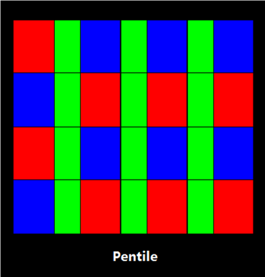 iPhone X/Xs/11 Pro系列采用的三星Super Amoled屏幕,放大就是上图这样的色块。通过修改“颜色大小”,让蓝色更大,从而获得更长的发光时间。上图也是“钻石排列”的示意图,是目前Amoled在显示效果和使用寿命之间取得平衡的“最优解”。缺点是像素点大小不同,显示效果也要打折扣,同样分辨率比起LCD总是要低一点。