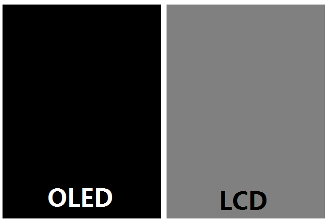 由于OLED面板不需要背光层,非常轻薄,有效节省有限的手机空间。这块屏幕是由无数个“小灯泡”组合而成,可以单独亮起来,所以黑色完全不发光,黑的非常纯粹还省电。同时,OLED屏幕的色彩更艳丽,对于HDR视频的支持也更好。下图就是模拟OLED屏幕和LCD屏幕显示纯黑色图片的效果图。(最近大火的“暗黑模式”就是基于这个特性推出的哦!)