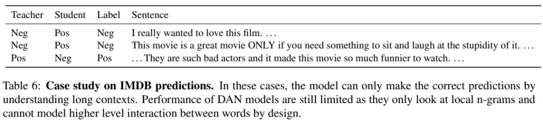 作者分别选取了三类模型,作为本文模型的对比实验:(1)不加入模型蒸馏,直接训练学生模型;(2)使用不基于 DAN 的学生模型结构,例如 Bi-LSTM 或 CNN;(3)直接对已有的压缩模型进行 fine-tune,例如 DistilBERT [2] 和 MobileBERT [3]。