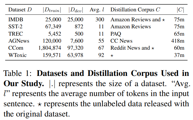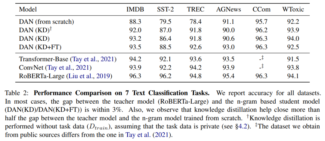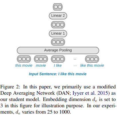 本文使用的学生模型基于 DAN(Deep Averaging Network) 网络 [1],其采用简单的架构,将输入句子中的 n-gram 映射到 embedding 并进行平均池化聚合,然后再使用多个线性层进行分类。通过选择 n-gram 词汇表和 embedding 维度,DAN 可以扩展到数十亿个参数。同时,由于在训练和推理期间 DAN 被稀疏激活,因此成本可以保持在较低水平。DAN 的一个弱势在于无法像自注意力一样计算 long-range contexts,但是根据研究表明,在某些任务上 DAN 可以取得与自注意力相当的结果。