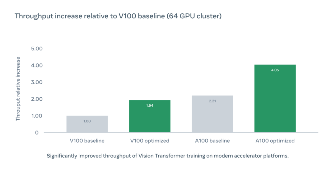 对于使用 PyCIs 训练的 ViT 模型,Meta AI 的方法可以提升训练速度和每加速器吞吐量(TFLOPS)。