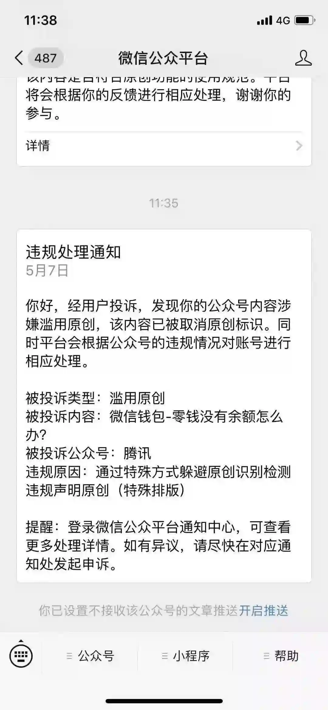 随后公众号作者回复该网友表示:“已被微信公众平台判定滥用原创,取消原创。请大家以我为鉴。”微信违规处理通知显示,“腾讯”官方公号违规原因为“通过特殊方式躲避原创识别检测违规识别原创”。
