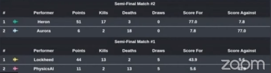 8 月 19 日,八支参赛团队展开循环赛,最终四支团队进入半决赛(Semi-Final Match),分别为 Aurora Flight Sciences、Heron Systems、Lockheed Martin 和 PhysicsAI。