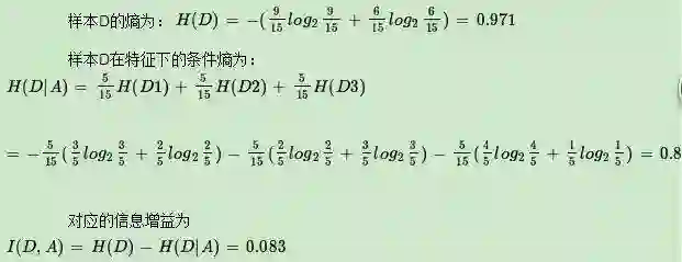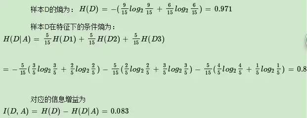 上面提到ID3算法就是用信息增益大小来判断当前节点应该用什么特征来构建决策树,用计算出的信息增益最大的特征来建立决策树的当前节点。这里我们举一个信息增益计算的具体的例子。比如我们有15个样本D,输出为0或者1。其中有9个输出为0, 6个输出为1。 样本中有个特征A,取值为A1,A2和A3。在取值为A1的样本的输出中,有3个输出为1, 2个输出为0,取值为A2的样本输出中,2个输出为1,3个输出为0, 在取值为A3的样本中,4个输出为1,1个输出为0.
