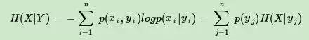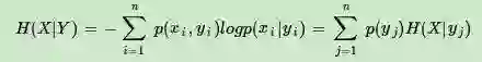 有了联合熵,又可以得到条件熵的表达式H(X|Y),条件熵类似于条件概率,它度量了我们的X在知道Y以后剩下的不确定性。表达式如下: