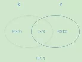 下面这个图可以比较清晰的反映他们之间的关系。左边的椭圆代表H(X),右边的椭圆代表H(Y),中间重合的部分就是我们的互信息或者信息增益I(X,Y), 左边的椭圆去掉重合部分就是H(X|Y),右边的椭圆去掉重合部分就是H(Y|X)。两个椭圆的并就是H(X,Y)。
