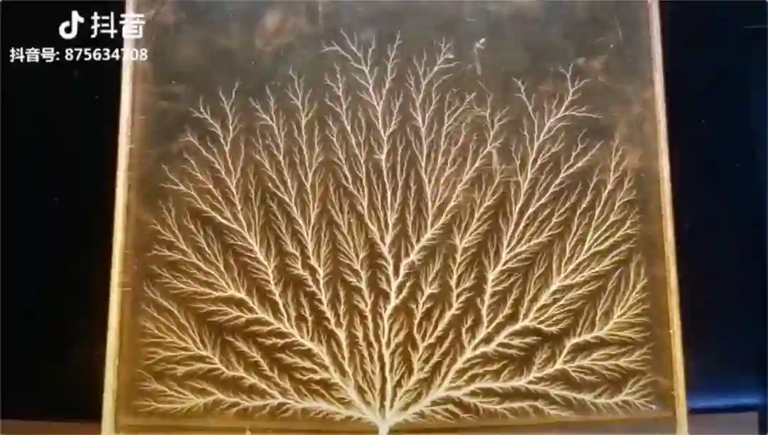 将一枚钉子架在一块有机玻璃板上,用锤子轻轻敲击钉子后,玻璃上瞬间绽放出一棵发光的树。这段被称为“束流树”的实验为陈征的抖音账号带去不少人气,那个名为“利希滕贝格图形”听起来有些拗口的现象在他们心中有了具体的模样。为了找到适合的实验道具,陈征跑遍了高能物理所,折腾了一个多月才如愿。