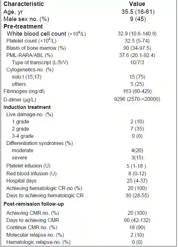 本研究20例患者治疗后达CR的中位时间为30天(28-50天)。20例患者均接受了羟基脲治疗,其中16例患者同时接受了阿糖胞苷治疗,阿糖胞苷的中位给药时间为6天(3-14天)。诱导治疗期间,分别有0例和7例患者发生了3-4级肝脏不良事件和分化综合征。无患者发生血液学复发,2例患者在12个月和15个月时发生分子学复发,在接受原方案治疗后再次达到CMR,并且不需要进行干细胞移植也能长期保持CR。详见表1。