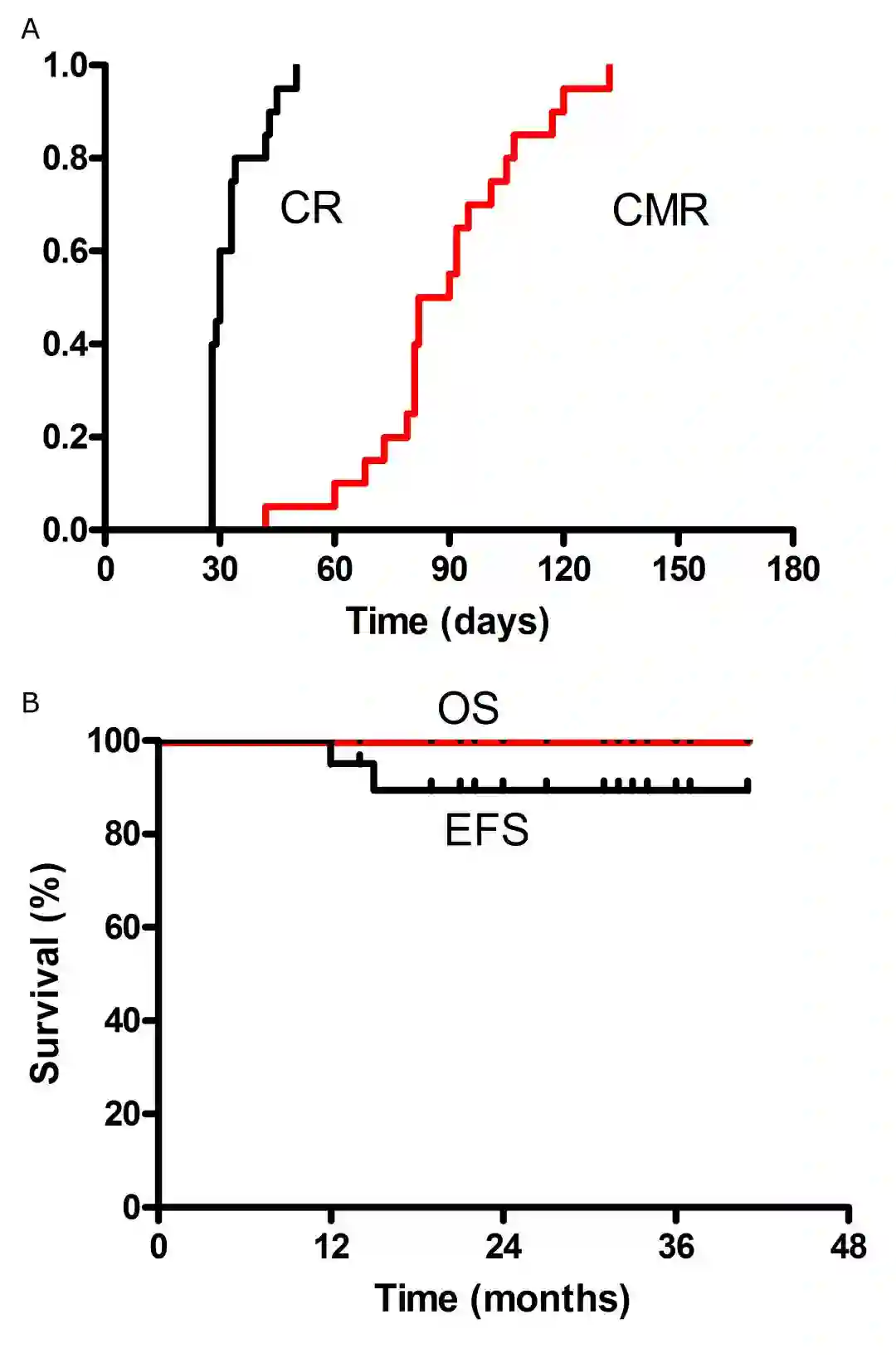 图1:A本研究患者达CR和CMR情况;B 本研究患者EFS和OS情况。