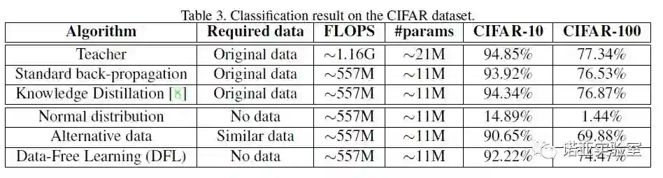 我们还在CIFAR-10和100数据集上进行了实验,使用的教师和学生模型分别为Resnet-34和18。 在CIFAR上,我们使用CIFAR-10的数据作为CIFAR-100的替代训练集,使用CIFAR-100的数据作为CIFAR-10的替代训练集,虽然CIFAR-10和100非常相似,并且具有一些重叠的图片,然而,得到的结果距离使用原始数据集仍然有较大的差距,证明了在实际情况中使用相似的数据集来替代原始数据集并不能取得很好效果。 本论文提出的方法同样取得了和使用原始数据集的蒸馏算法相似的结果,并且超越了使用替代数据集的结果。
