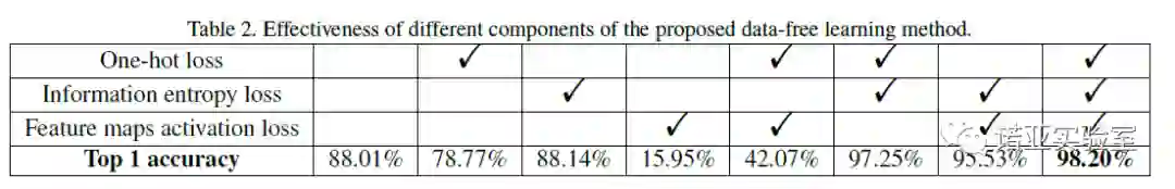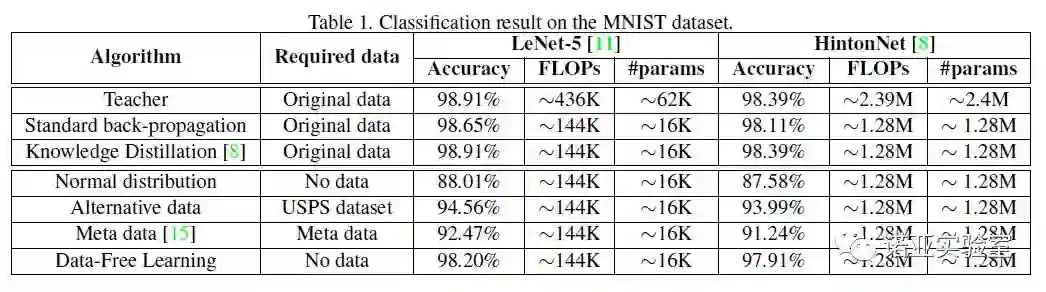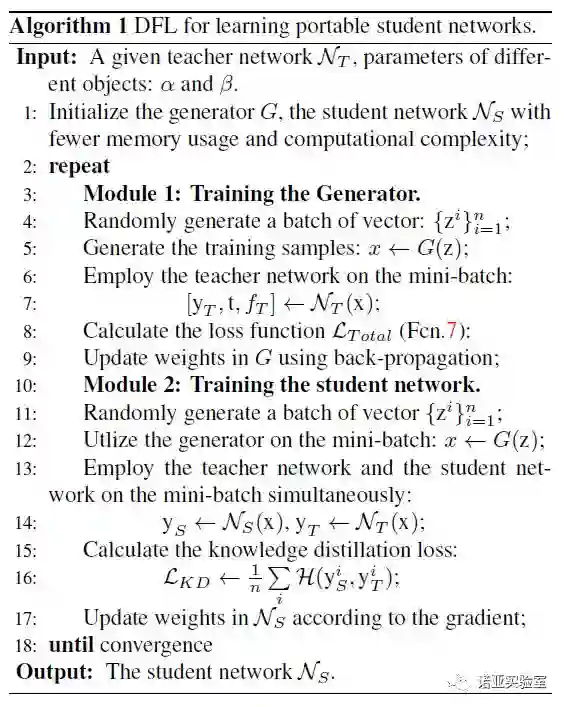算法1是本论文方法的流程。 通过公式(5),我们可以训练一个生成器来生成和原始图片服从相似分布的数据。 接着,我们使用生成数据,基于蒸馏算法训练学生网络,从而完成无数据情况下的网络压缩。