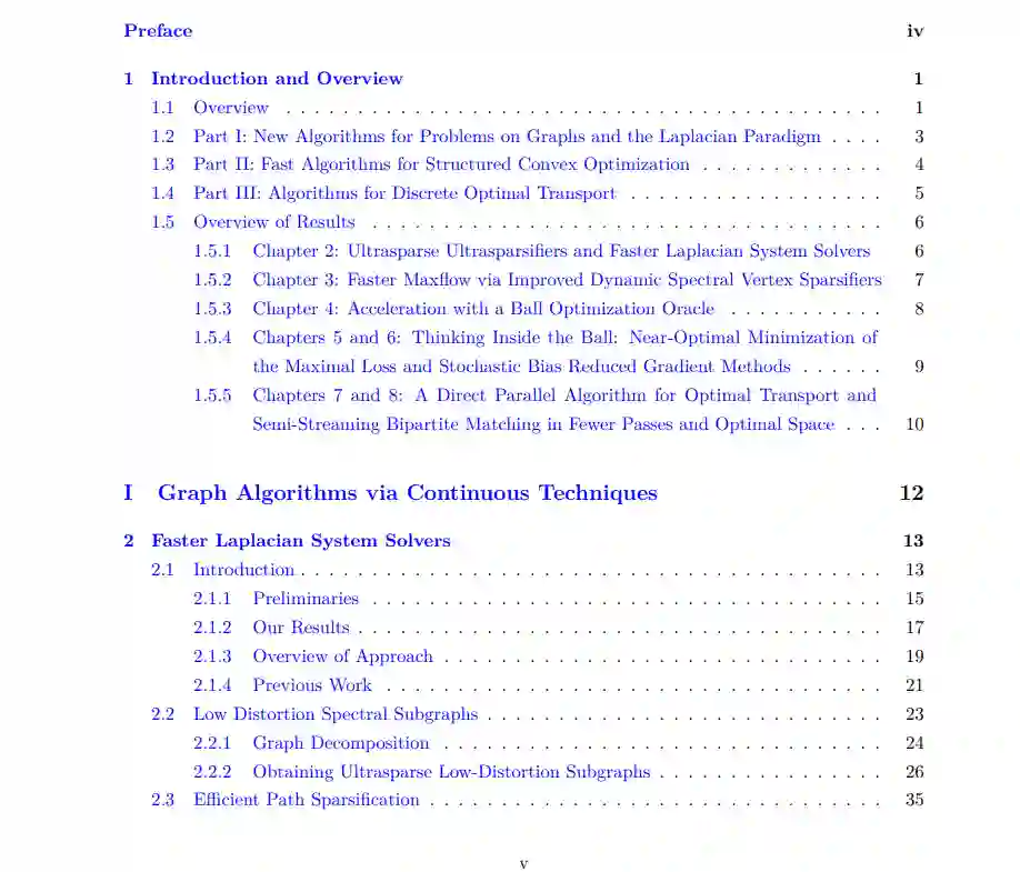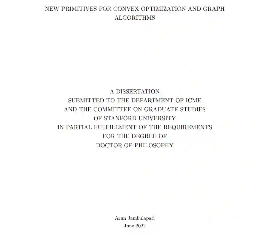 第一部分给出了求解拉普拉斯线性系统的最先进算法,以及求解最小成本流的更快算法。我们的结果是通过新颖的组合经典迭代方法,从凸优化与基于图的数据结构和预调节器。第二部分给出了若干类结构凸优化问题的新算法。给出了凸函数极小化的近似最优方法,包括球优化oracle和N个凸函数的最大值极小化,以及投影极小化和复合凸极小化的新算法。我们的结果是通过对经典加速梯度方法的更精细的理解实现的,并为各种重要的机器学习任务,如逻辑回归和硬边界支持向量机提供了新的算法。第三部分讨论了离散最优传输问题算法的进展,这是一个近年来由于深度学习的新应用而引起极大兴趣的任务。我们给出了简单的并行算法来逼近离散最优传输,并进一步证明了这些算法可以在空间界和流设置中实现。通过进一步利用我们的机制,我们还对半流模型中的图优化问题(如二部匹配和转运)给出了改进的复杂度边界。