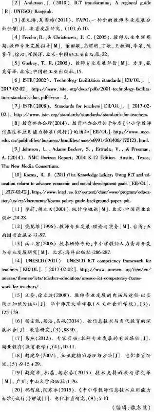 《新媒体联盟地平线报告:2014基础教育版》指出,“重塑教师角色”是未来一到两年学校教育技术应用的关键因素(Johnson,2014)。随着信息技术的迅速发展及其在教育教学中的逐步应用,教师被期待能够熟练运用信息技术和其他方法改进工作,如教学内容的传递、学生学业的评估、教师之间的合作以及学校的日常工作事务等。教师信息技术应用能力建设进程中,培训是推动能力发展的重要路径,如我国推出的“中小学教师国家级培训计划”“全国中小学教师信息技术应用能力提升工程”等。另外,非营利机构组织的教师培训对教师能力发展也有着重要作用,如英特尔·未来教育项目、IBM重塑教育项目、惠普优创项目等。校际合作、校本培训等也是提升教师能力的有效路径,如新加坡校群、湖南基地校等。信息技术的发展及其在教育教学领域的深入应用,也为教师能力发展提供了新的方式,如基于学科教研的网络学习社区、基于社会化软件的教师发展群、基于课程的教师专题学习网站、基于论坛的教师协作知识建构、基于资源分享的教师专业成长等,这些均在提升教师信息技术应用能力的过程中发挥了重要作用。但是,这些推动教师信息技术应用能力发展的活动是否真正考虑了一线教师的工作实际及发展现状?大量不连贯的且与教师需求和实践无关的知识讲授,使得教师不能基于所学知识及技能解决教学实践中面临的问题,这使得活动效果大打折扣。我国的教师培训一直强调“按需施训”,有研究者指出,“需”不能简单理解为教师的需求,而要理解为教师某项能力与应达到标准之间的距离(祝智庭等,2015)。由此,教师信息技术应用能力应达到的“标准”是什么?不同教师应达到的“标准”是否不同?面对不同“标准”导向的教师,其信息技术应用能力的影响因素、发展路径、建设策略、方法是否不同?本研究关注教师信息技术应用能力的发展,通过分析教师信息技术应用能力的构成要素、发展阶段、影响因素、发展路径等,构建教师信息技术应用能力发展分析模型,以帮助不同发展水平的教师明确所处阶段、存在的问题及未来发展。
