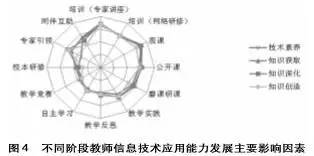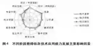 通过对四个阶段教师信息技术应用能力的影响因素进行分析,本研究发现不同阶段教师信息技术应用能力影响因素不同,但整体差异不大(见图4)