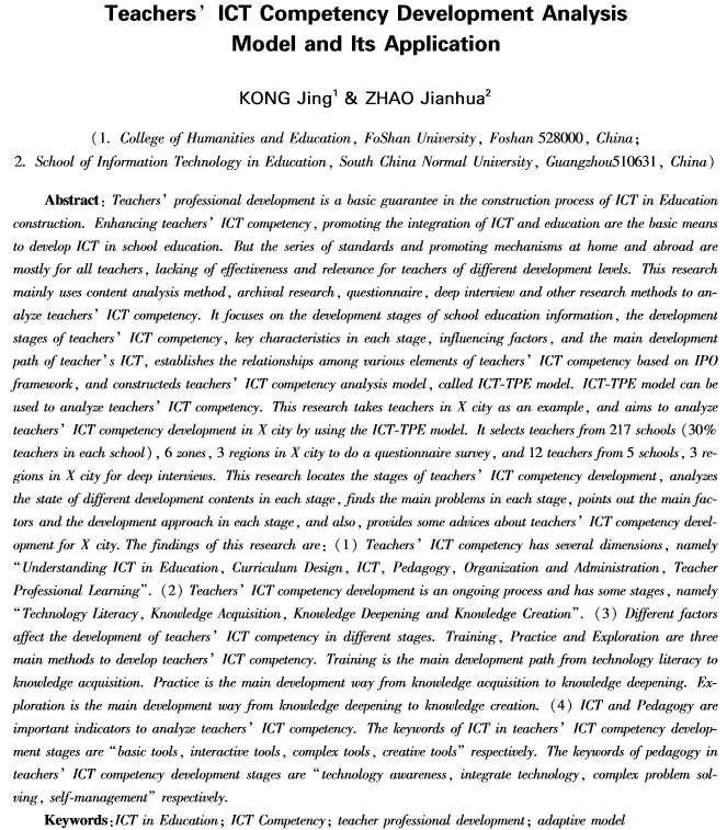本研究构建了教师信息技术应用能力发展分析模型,即ICT-TPE适应性模型,可用于分析教师信息技术应用能力的发展现状、主要问题,定位教师能力发展阶段,并为教师能力的提升指出相应的发展路径及策略、方法等。