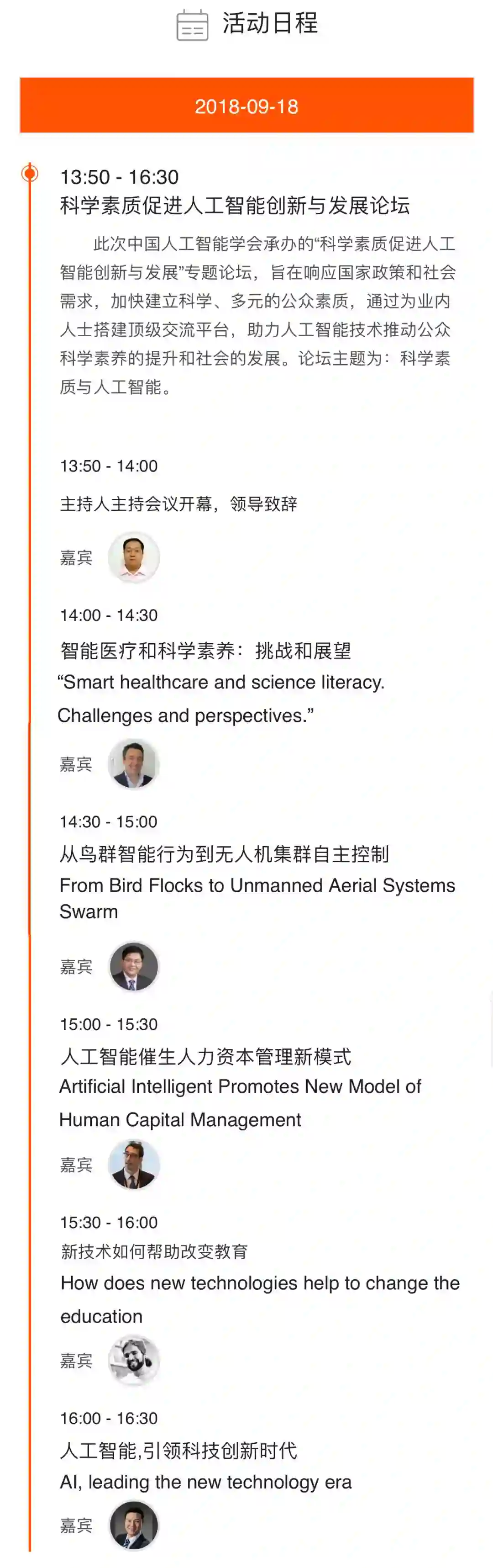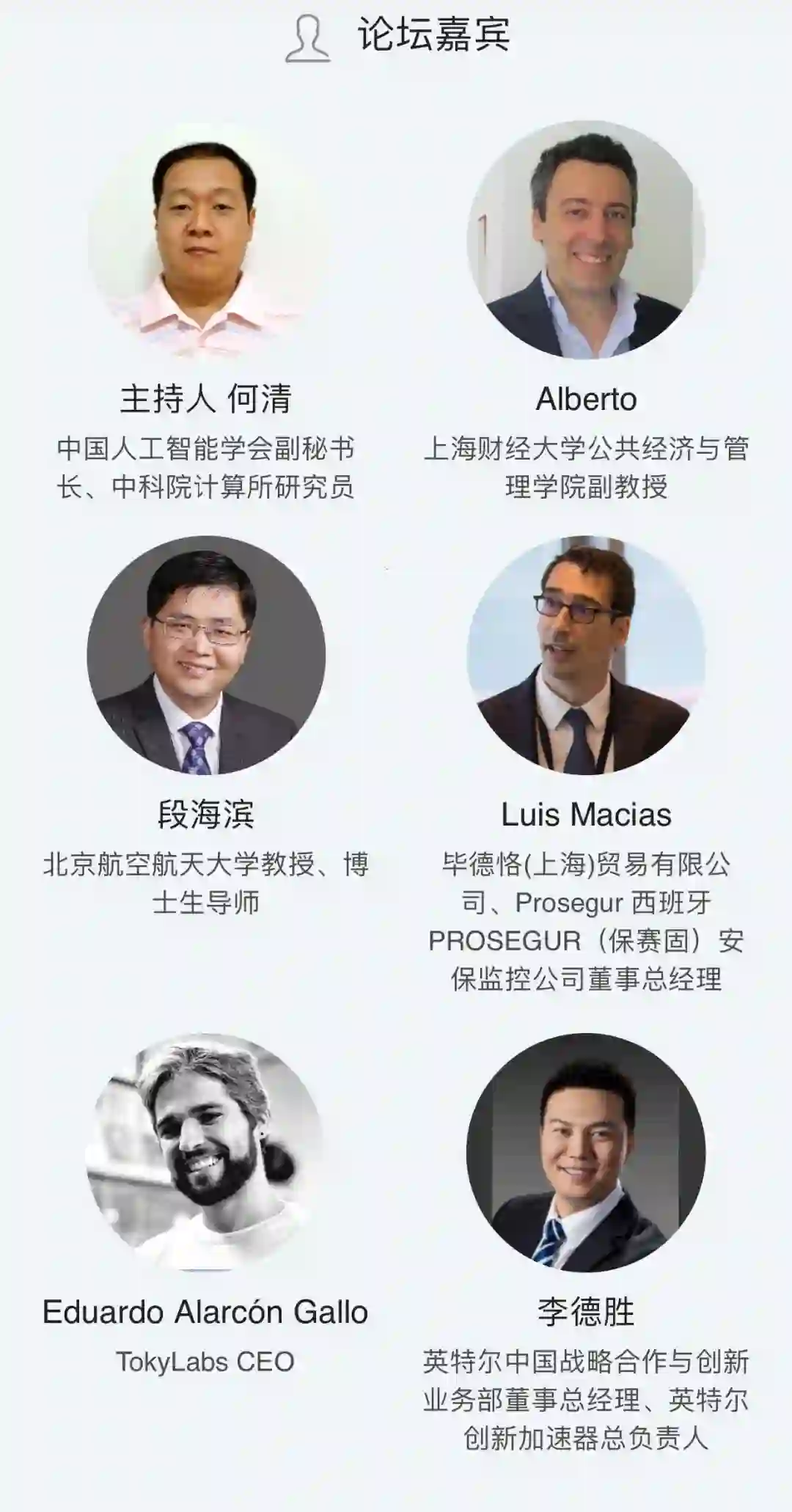 论坛邀请了上海财经大学公共经济与管理学院副教授Alberto,北京航空航天大学教授兼博士生导师段海滨,毕德恪(上海)贸易有限公司、Prosegur 西班牙PROSEGUR(保赛固)安保监控公司董事总经理Luis Macias,TokyLabs CEO Eduardo Alarcón Gallo,英特尔中国战略合作与创新业务部董事总经理、英特尔创新加速器总负责人李德胜等海内外知名专家学者将应邀登台并发表演讲,中国人工智能学会副秘书长、中科院计算所研究员何清担任论坛主持人,共同探索科学素质与人工智能的话题。
