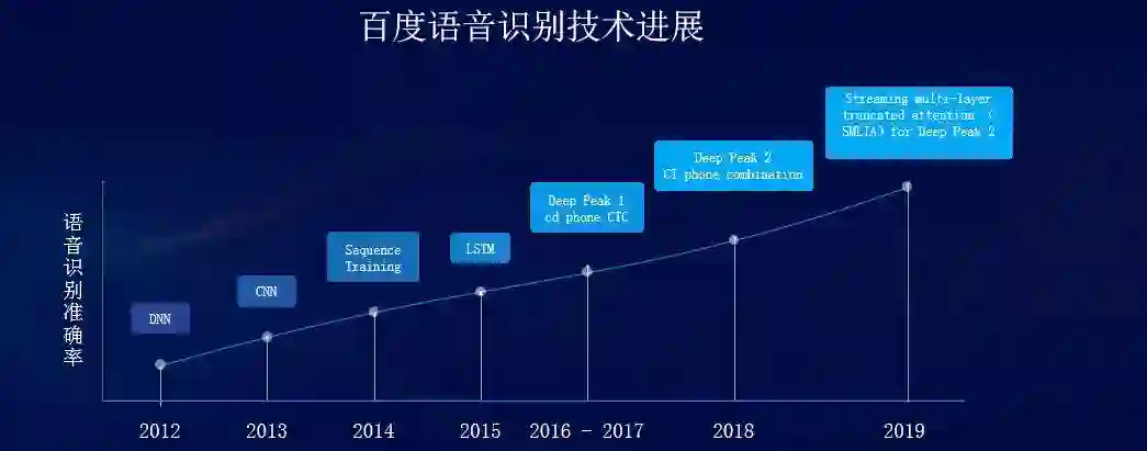关于在线语音识别,百度发布了流式多级的截断注意力建模(SMLTA),将在线语音识别准确率相对于上一代 Deep Peak 2 再次提升 15%,并实现了基于 SMLTA 模型的在线语音识别服务大规模上线应用。