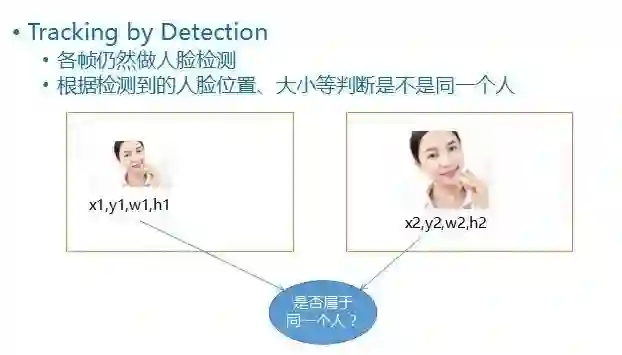 这种检测方法叫做Tracking by Detection,即每一帧仍然去做人脸检测,检测到人脸以后,根据每一个人脸的四个值,即他的坐标位置,他的宽、高,去比较前后两帧的人脸的位置和大小,大概可以推测出这两个人脸到底是不是属于同一个移动物体。
