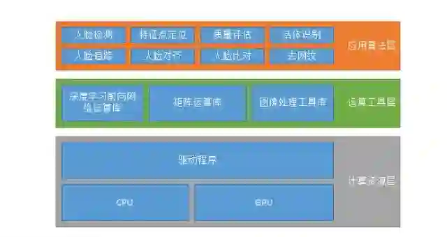 一般所谓系统构成不一定是人脸识别系统,各种AI系统大概都会如此。首先是计算资源层,在CPU或GPU上运行,在GPU上运行可能还有CUDA,CUDN等的支持。