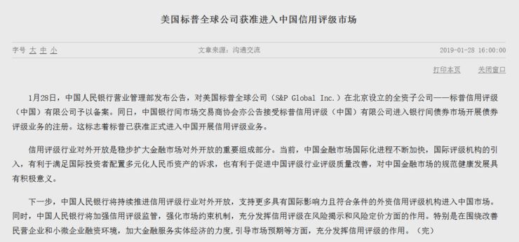 雷锋网AI金融评论报道,1月28日,央行在官网发布了美国标普全球公司获准进入中国信用评级市场的消息。