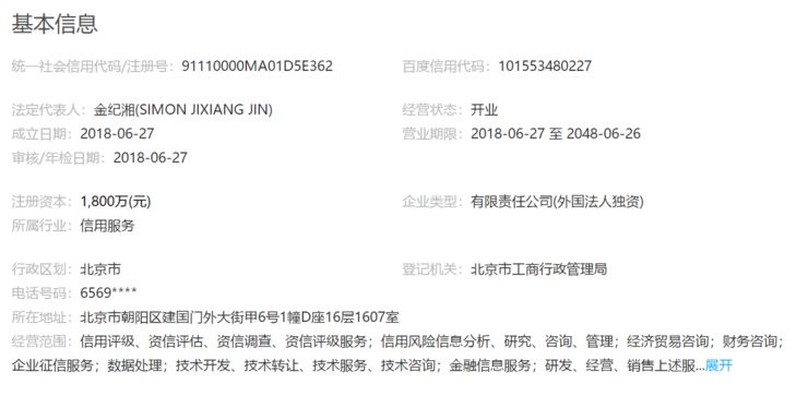 百度企业信用显示,标普信用评级(中国)有限公司成立于2018年6月,注册资本1800万,法定代表人是标准普尔评级服务董事总经理、大中华区总裁金纪湘。雷锋网了解到,金纪湘常驻北京,负责标准普尔在中国大陆、香港和台湾地区的业务发展,曾任瑞士银行(中国)有限公司行长兼董事总经理。
