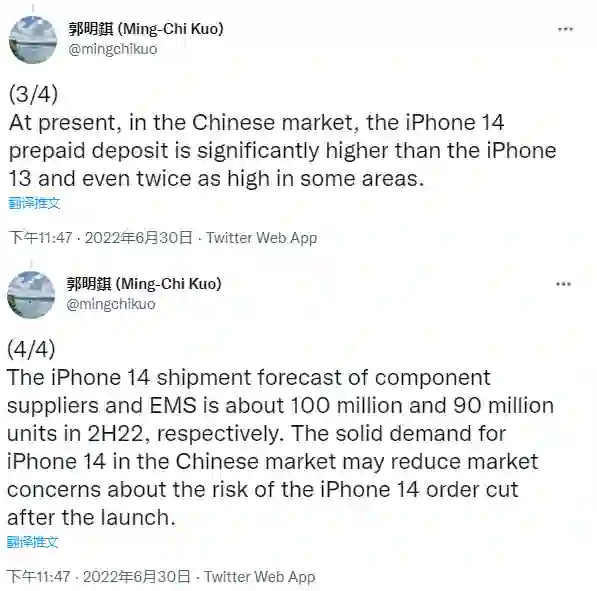 零部件供应商和物流方面的人士分析预测,苹果 iPhone 14 今年下半年的出货量可能会达到约为 1 亿部或 9000 万部。中国市场对 iPhone 14 的强劲需求可能会缓解市场对 iPhone 14 上市后订单减少问题的担忧。