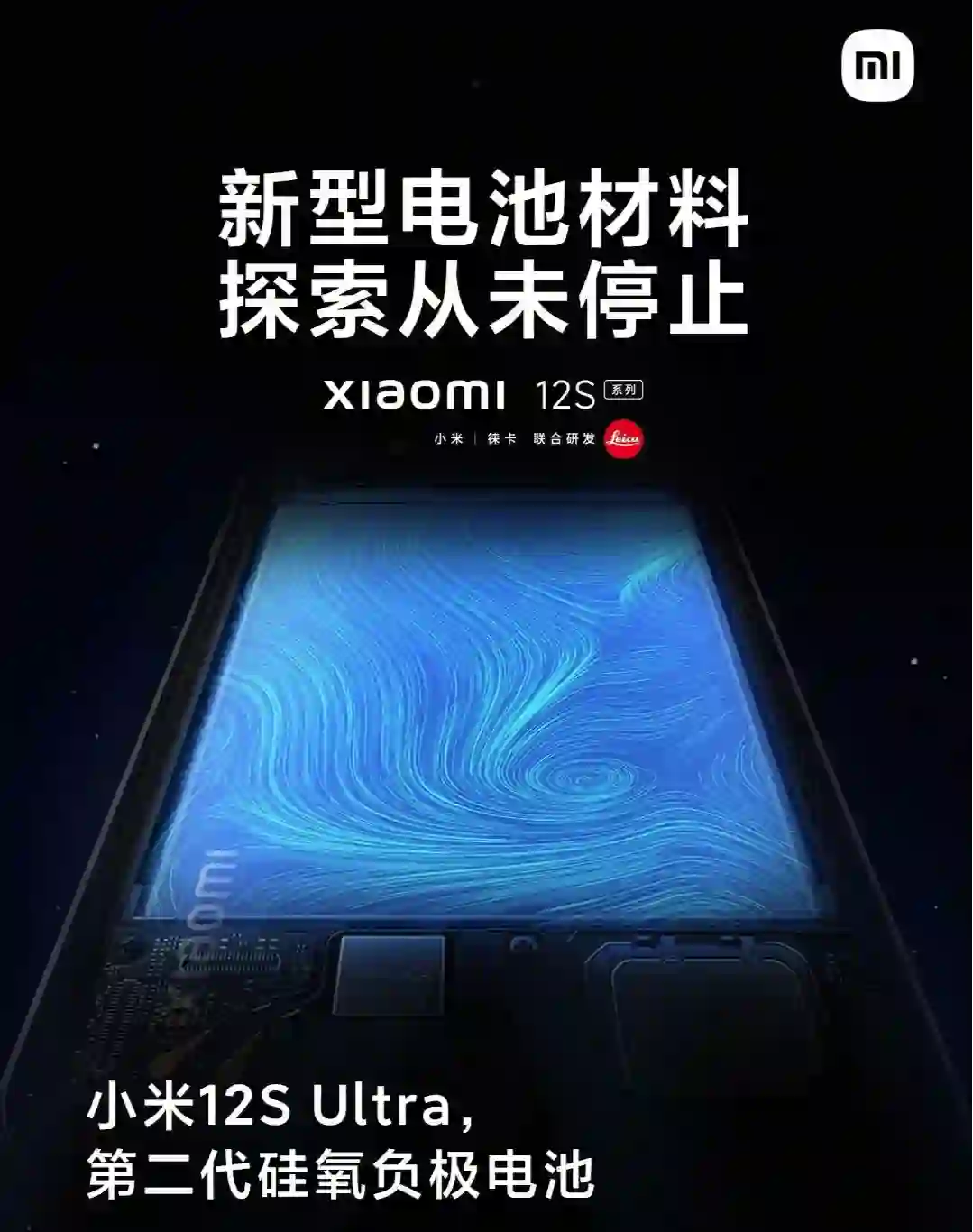 小米12S 将会搭载新一代钴酸锂电池,耐压体系和创新设计,容量增加了100mAh,小机身有大电量。小米12SUltra 则搭载了更贵的第二代硅氧负极电池,在负极中加纳米级富锂硅氧材料,4 倍锂离子存储能力。这是动力电池技术在手机上最新应用。