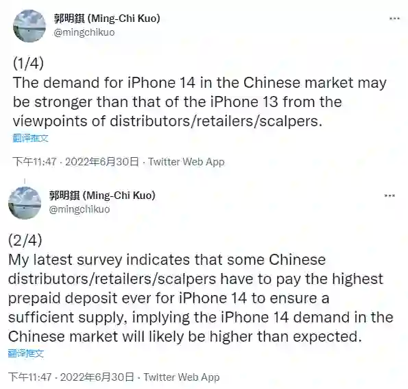 天风国际分析师郭明錤今日表示,从目前调查结果对国内经销商、零售商和黄牛的最新调查结果来看,国内的零售商/分销商/黄牛已为 iPhone 14 系列支付了有史以来最高的预付定金,甚至在某些地区足足高出一倍,从而保证供应充足。预付定金明显高于 iPhone 13 这也意味着国内对 iPhone 14的需求可能会高于预期。
