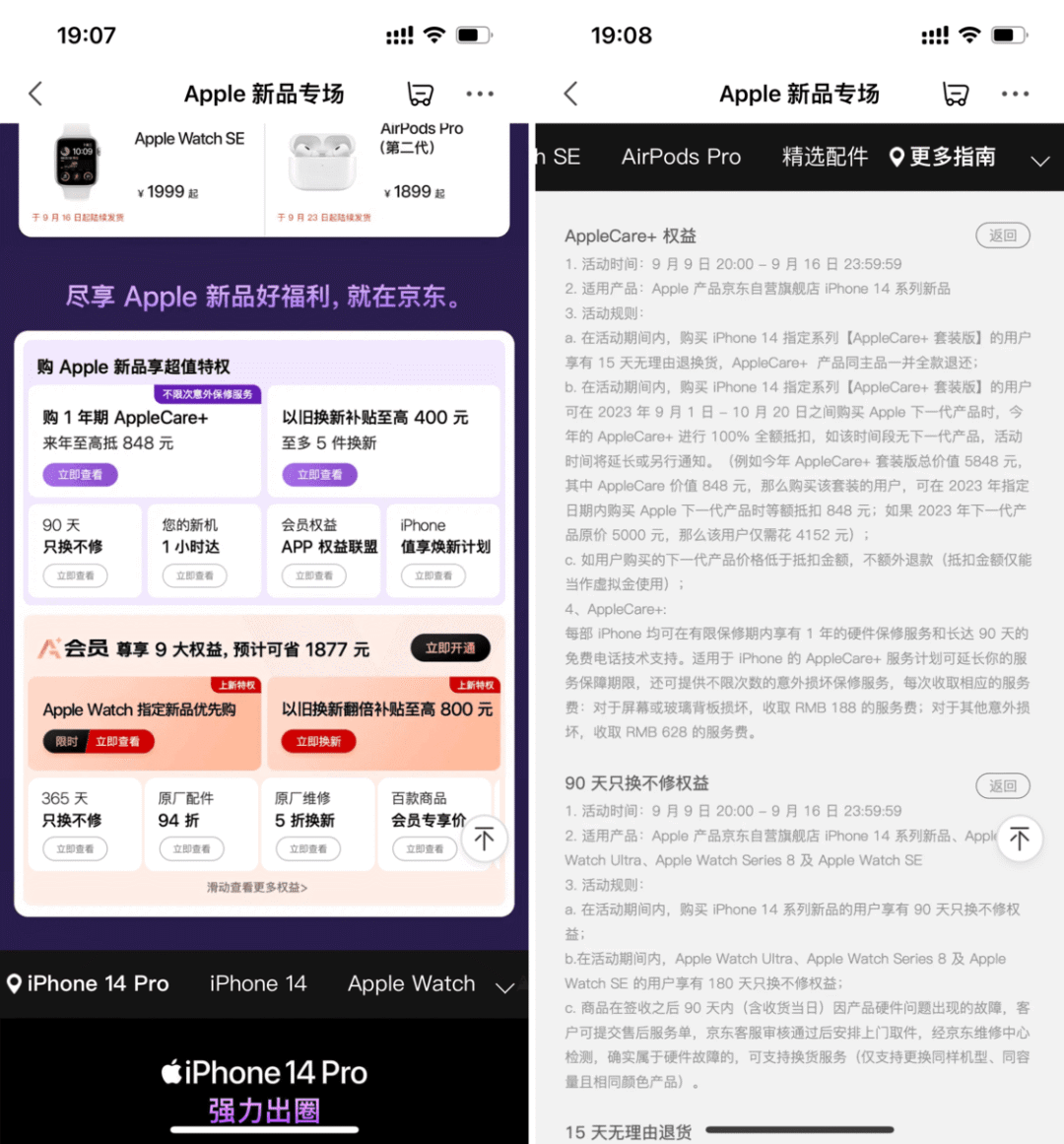 不过作为最快、最保险和最值得信赖的选择,Apple Store 即使没有优惠却依然是最佳的购机方式。而且,24 期免息分期对消费者的诱惑力,实际上远超其他电商平台降价或补贴几百元所带来的小优惠。只要你拥有招商银行、建设银行、工商银行信用卡,额度达到或超过你心仪的 iPhone 售价,即可在付款时选择。与此同时,花呗额度足够的消费者,也可以在 Apple 官网或者天猫旗舰店选择 12 期免息分期。如果你现在的 iPhone 拥有「年年焕新」计划,可以在开售预约时选择前往线下的 Apple Store 直营店,以设备原售价的半价折抵购买新 iPhone。此外,原机器的 AppleCare+ 也可以按照剩余服务时间退款,退回的款项不但可以用来折抵购买新 iPhone,也可以用于折抵购买新 iPhone 的 AppleCare+ 服务。与去年 iPhone 13 系列不同的是,今年的 iPhone「年年焕新」计划取消了「线上购机线上换,线下购机线下换」的限制,无论是在 Apple Store 的在线商店还是实体直营店购买的新款 iPhone,只要加入了「年年焕新」,未来符合条件时,就可以从线上或线下两种方式里任选一种进行升级换购。值得一提的是,你可以通过「年年焕新」预约一台新 iPhone,在线下购买时向店员表示,你不想折抵旧机而是全款支付,也同样可以购买到新 iPhone。根据去年的实测,通过「年年焕新」渠道能够抢到首批 iPhone 购买资格的概率,可能要比在官网选购新机的方式更大一些(原因之一是不需要付款,而是在线下购买时才支付)。对于不满足年年焕新的其他 Apple 设备,也可以通过 Apple Trade in 计划进行折抵。价格虽然相比第三方平台或自售二手要低,但胜在省心和可以多个 Apple 设备同时折抵,且 Apple 对符合折抵要求的设备是「不看成色」的 —— 只要不是屏幕或背板碎裂及严重损伤,小磕碰和正常使用带来的旧损,均不影响折抵的价格。
