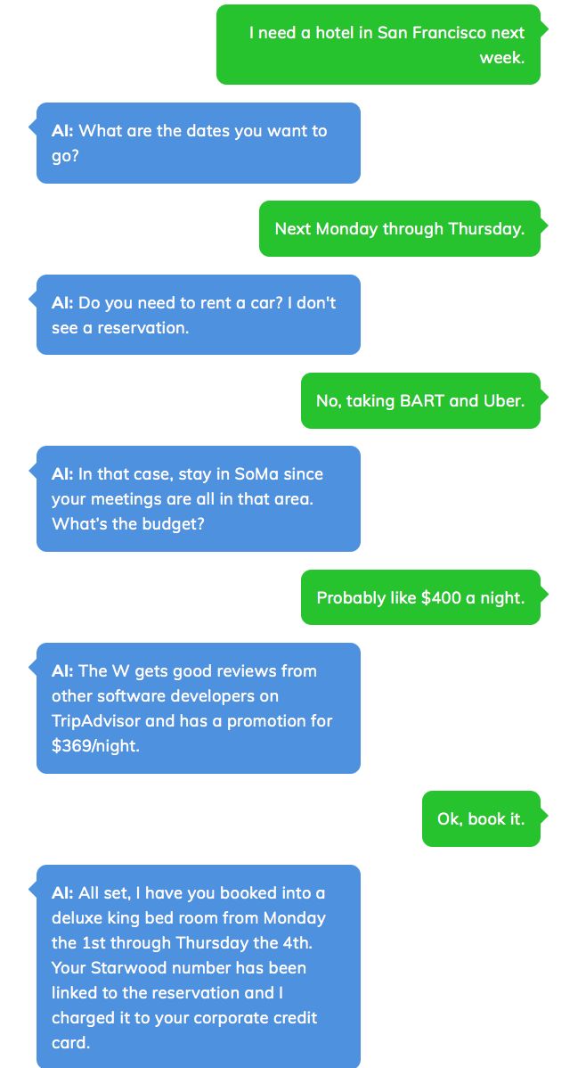 这是 Semantic Machines 在 2016 年放于公司官网的截图,从这张图中我们能够看到 AI 更为主动的提出了出行方式、预算等问题,并且从复杂的信息中做出了个性化的推荐、判断。据 TechCrunch 称,在 2016 年的实际体验比图片上要更丰富,该 AI 还能够回顾之前的预订记录,用来复用。