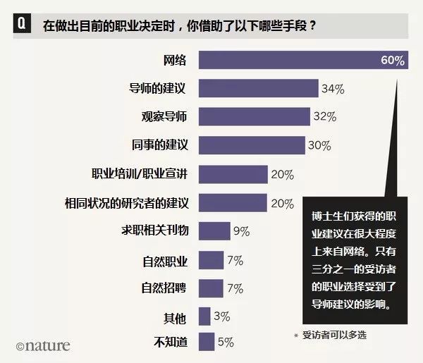在很大程度上,博士生是自己的职业顾问。在被问到是如何做出目前的就业决定时,差不多三分之二的人表示是靠自己搜索调查;只有34%的人表示是来自导师的建议。